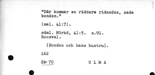 //// - ! //// "Där kommer en riddare ridandes, sade //// bonden." //// t' //// (mel. 41:7). //// - //// sdml. Mörk§, 41:5. s.91. //// Roosval. //// (Bonden och hans hustru). //// ^ 162 //// Sk^ 70 U L M A ////