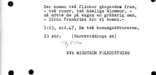 //// * Der kommo två flickor gångandes fram, //// - två rosor, två ädeliga blommor, - //// så mötte de på vägen en gråharig man, //// - Ifrån Frankrike äro vi komna.- //// 1:23, sid.47, De två konungadöttrarna, //// 23 str. (Norrkviddinge sn) //// EVA WIGSTRÖM FOLKDIKTNING ////