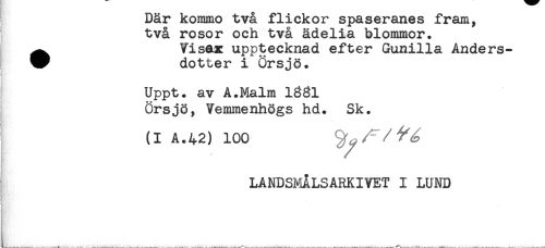 //// Dar kommo tva flickor spaseranes fram, //// två rosor och två ädelia blommor. //// ^ Visan upptecknad efter Gunilla Anders- //// W dotter i Örsjö. //// Uppt. av A.Malm 1831 //// örsjö, Vemmenhögs hd. Sk. //// (I A.42) 100 //// j LANDSMÅLSARKIVET I LUND ////