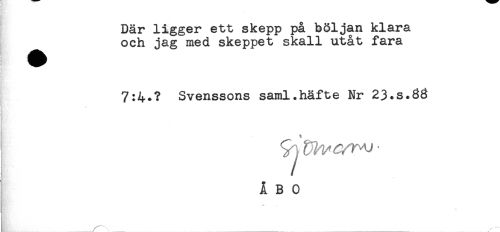 //// H; //// Där ligger ett skepp på böljan klara //// och jag med skeppet skall utåt fara //// 7:4.? Svenssons saml.häfte Nr 23.S.83 //// ? //// j ÅBO //// t..... ////