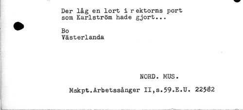 //// Der låg en lort i r ektorns port //// ! som Karlström hade gjort... //// ^ Bo //// Västerlanda //// - //// 4 //// NORD. MUS. //// Mskpt.Arbetssånger II,s.59.E.U. 225S2 ////