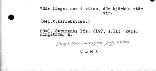 //// "Där längst ner i viken, där björken står //// ^ vit. //// (Mel.t.kärlek svis a.) //// Sdml. Strängnäs lfs. 2197, s.113 kaps. //// Ringström, K. //// U L M A ////