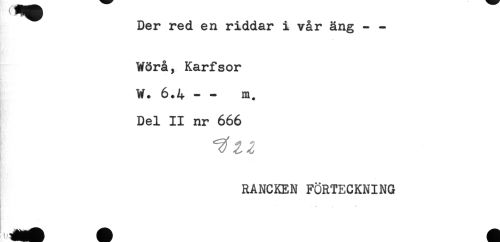 //// Der red en riddar i vår äng - - //// Wörå, Karfsor //// W. 6.4 - - m. //// Del II nr 666 //// RANCKEN FÖRTECKNING //// * . * ////