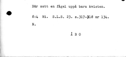 //// Där satt en fågel uppå bara kvisten. //// Bi! //// 8:4 Hi. S.L.S. 23. s.317-318 nr 134. //// N. //// ÅBO ////