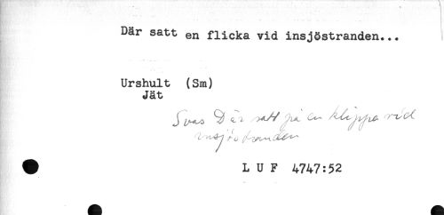 //// ...... ...... - - - - - - - - - - .......* //// Där satt en flicka vid insjöstranden... //// ....... . . //// Urshult (Sm) //// Jät //// # L U F 4747:52 //// . ////