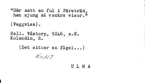//// i //// ! //// "Där satt en ful i Päreträd, //// han sjung så vackra visor." //// (Vaggvisa). //// Hall. Våxtorp, 9246, s.3. //// Kolmodin, R. //// t //// (Det sitter en fågel...) //// U L M A ////