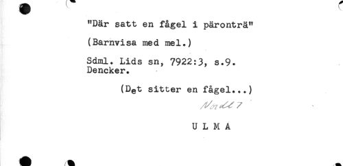 //// "Där satt en fågel i päronträ" //// (Barnvisa med mel.) //// Sdml. Lids sn, 7922:3, s.9. //// Dencker. //// (Det sitter en fågel...) //// U L M A ////