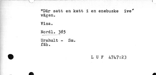 //// "Där satt en katt i en enebuske ive* //// vägen. //// Visa. //// Nordl. //// Urshult - Sm. //// fäb. //// # L U F 4747:23 ////