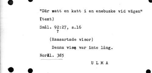 //// "Där watt en katt i en enebuske vid vägen" //// B, //// ^text) //// ... //// Smål. 92:27, s.16 //// ? //// ! . ' //// (Ramsartade visor) //// Denna vis^t var inte lång. //// Noräl. 3^5 //// U L M A ////
