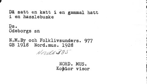 //// B //// H //// Då satt en katt i en gammal hatt L //// i en hasslebuske //// Ds. //// Ödeborgs sn ^ //// r //// N.M.By och Folklivsunders. 977 E //// GB 1918 Nord.mus. 1928 { //// c //// i //// NORD. MUS. j //// Kopior visor ! //// ] ////