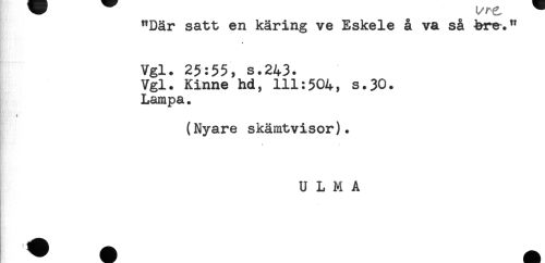 //// "Där satt en käring ve Eskele å va så bre." //// 4 //// Vgl. 25:55, s.243. //// Vgl. Kinne hd, 111:504, s.30. //// Lampa. //// (Nyare skämtvisor). //// \ - //// U L M A ////