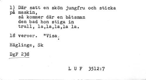 //// 1) Där satt en skön jungfru och sticka //// på maskin, //// så kommer där en båtsman //// den bad hon stiga in //// trall, la,la,la,la la. //// 13 verser. "Visa. //// * //// Häglinge, Sk //// DgF 236 //// L U F 3512:7 ////