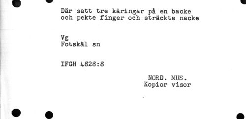 //// Där satt tre käringar på en backe //// och pekte finger och sträckte nacke //// Vg //// Fotskål sn //// IFGH 4323:3 //// NORD. MUS. //// Kopior visor ////
