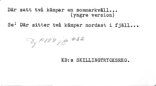 //// Där satt två kämpar en sommarkväll... //// (yngre version) //// Se- Där sitter två kämpar nordast i fjäll... //// ? ^ //// KB:s SKILLINGTRYCKSREG. //// ...... ..... ...... ^ ////