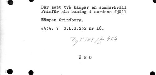 //// Där satt två kämpar en sommarkväll //// Framför sin boning i nordens fjäll //// Bämpen Grindborg. //// 44:4. ? S.L.S.252 nr 16. //// ÅBO //// * ////