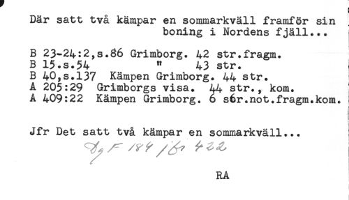 //// a //// Där satt två kämpar en sommarkväll framför sin //// boning i Nordens fjäll... //// B 23-24:2,s.86 Grimborg. 42 str.fragm. //// B 15.S.54 " 43 str. //// B 40,s.137 Kämpen Grimborg. 44 str. //// A 205:29 Grimborgs visa. 44 str., kom. //// A 409:22 Kämpen Grimborg. 6 s6r.not.fragm.kom. //// t //// ! //// ! //// Jfr Det satt två kämpar en sommarkväll... : //// RA ////