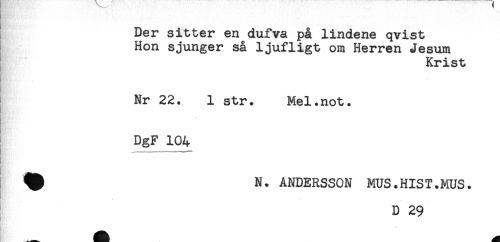 //// Der sitter en dufva på lindene qvist //// Hon sjunger så ljufligt om Herren Jesum //// Krist //// Nr 22. 1 str. Mel.not. //// DgF 104 //// ^ N. ANDERSSON MUS.HIST.MUS. //// D 29 ////