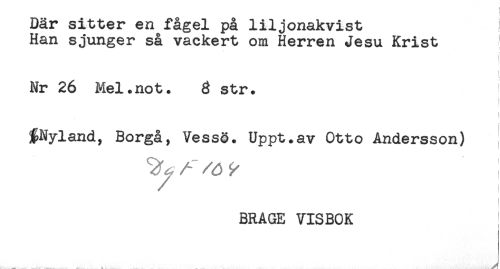 //// Där sitter en fågel på liljonakvist //// Han sjunger så vackert om Herren Jesu Krist ' //// Nr 26 Mel. no t. 6 str. //// ! //// ' //// %Nyland, Borgå, VessS. Uppt.av Otto Andersson) //// BRAGE VISBOK ////