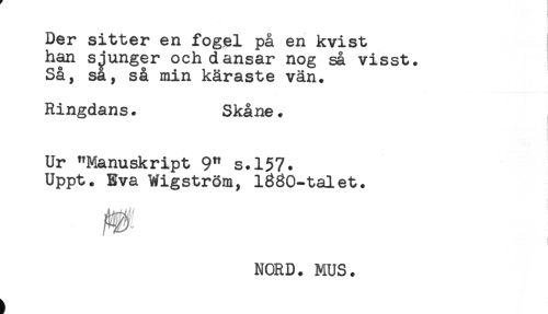//// Der sitter en fogel på en kvist //// han sjunger och dansar nog så visst. //// Så, sa, så min käraste vän. //// Ringdans. Skåne. //// Ur "Manuskript 9" s.157. //// Uppt. Eva Vigström, 1330-talet. //// NORD. MUS. ////