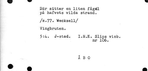 //// Där sitter en liten fågél //// på hafvets vilda strand. //// /s.77. Wecksell //// /Vingbruten. //// 5:4. J-stad. I.N.E. Slips visb. //// nr 106. //// . ////