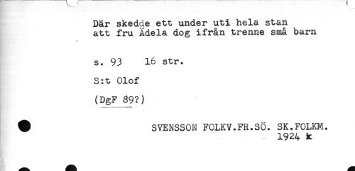 //// Där skedde ett under uti hela stan //// att fru Adela dog ifrån trenne små barn //// s. 93 16 Str. //// S:t Olof //// t' //// (DgF 89?) //// # SVENSSON FOLKV.FR.SÖ. SK.FOLKM. //// 1924 k ////