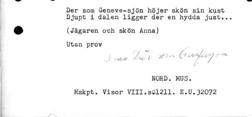 //// Der som Geneve-sjön höjer skön sin kust //// Djupt i dalen ligger der en hydda just... //// ^ (Jägaren och skön Anna) //// Utan prov //// j Al ^ - ^ ' ^" //// NORD. MUS. //// Mskpt. Visor VIII.scl211. E.U.32072 //// fh * //// r^'. _____ ////
