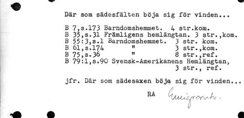 //// Där som sädesfälten böja sig för vinden... //// B 7,s.l73 Barndomshemmet. 4 str.kom. //// B 35,s.31 Främligens hemlängtan. 3 str.,kom. //// B 55:3,s.l Barndomshemmet. 3 str. kom. //// B 61,s.174 " 3 str.,kom. //// B 75,s.36 " 6 str.,ref. //// B 79:lyS.90 Svensk-Amerikanens Hemlängtan, //// [ 3 str., ref. //// jfr. Där som sädesaxen böja sig för vinden... //// [ RA \ ////