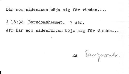 //// t //// Där som sädesaxen böja sig för vinden.... //// <* //// i //// - //// A 16:32 Barndomshemmet. 7 str. //// i //// Jfr Där som sädesfälten böja sig för vLnden... //// : //// i //// RA ' ^ , ////