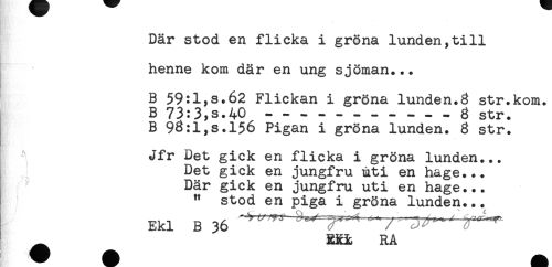 //// Där stod en flicka i gröna lunden,till //// henne kom där en ung sjöman... //// B 59:1,3.62 Flickan i gröna lunden.3 str.kom. //// B 73:3,s.40-----g str. //// B 93:l,s.l56 Pigan i gröna lunden. 8 str. //// Jfr Det gick en flicka i gröna lunden... //// Det gick en jungfru uti en hage... //// Där gick en jungfru uti en hage... //// " stod en piga i gröna lunden... //// Ekl B 36 " " / ' ^ //// ^ RXi RÅ ////