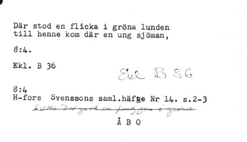 //// Där stod en flicka i gröna lunden //// till henne kom där en ung sjöman, //// 3:4. //// Ekl. B 36 //// a^ B - & //// 3:4 //// H-fors Svenssons saml.häfge Nr 14. s.2-3 ////