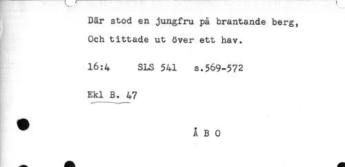 //// Där stod en jungfru på brantande berg, //// Och tittade ut över ett hav. //// 16:4 SLS 541 s.569-572 //// Ekl B. 47 ////