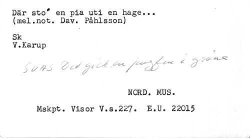 //// Där sto* en pia uti en hage... //// (mel.not. Dav. Påhlsson) //// Sk //// V.Karup //// c //// NORD. MUS. //// Mskpt. Visor V.s.227. E.U. 22015 //// \__:_____ j ////