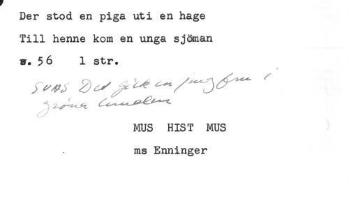 //// Der stod en piga uti en hage //// Till henne kom en unga sjöman //// w. 5 6 1 str. //// A //// MUS HIST MUS //// ms Enninger ////