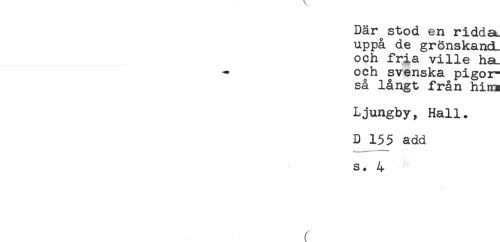 //// Där stod en ridda //// uppå de grönskand. //// och fria ville ha //// och svenska pigor //// så långt från him //// Ljungby, Hall. //// D 155 add //// s. 4 ////