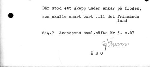 //// Där stod ett skepp under ankar på floden, //// som skulle snart bort till det frammande //// land //// 6:4*? Svenssons saml.häfte Nr 5* s.6? //// .PM****' //// ÅBO //// L_____ ////