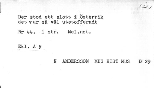 //// j //// Der stod ett slott i österrik //// det v ar så väl utstofferadt //// Nr 44* 1 str. Mel.not. //// ! //// I //// Ekl. A 5 //// N ANDERSSON MUS HIST MUS D 29 ////
