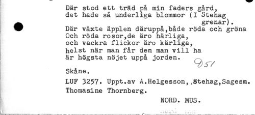 //// Dar stod ett trad pa mm i åders gard, //// det hade så underliga blommor (I Stehag //// ^ grenar). //// * Där växte äpplen däruppå,både röda och gröna //// Och röda rosörjde äro härliga, //// och vackra flickor äro kärliga, //// helst när man får den man vill ha //// är högsta nöjet uppå jorden. //// Skåne. //// LUF 3257* Uppt.av A.Helgesson,,§tehag,Sagesm. //// Thomasine Thornberg. //// NORD. MUS. ////