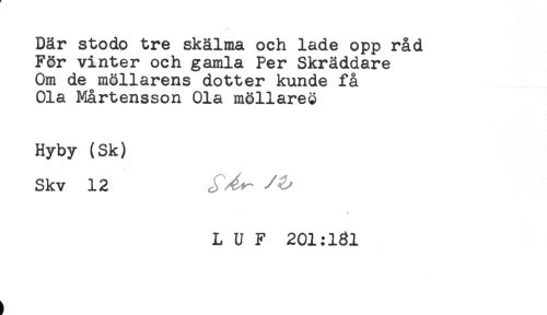 //// Där stodo tre skälma och lade opp råd //// För vinter och gamla Per Skräddare //// Om de möllarens dotter kunde få //// Ola Mårtensson Ola möllareö //// Hyby (Sk) //// Skv 12 ^^ //// L U F 201:131 ////