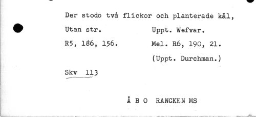 //// Der stodo två flickor och planterade kål, //// ^ Utan str. Uppt. Wefvar. //// R5, 186, 156. Mel. R6, 190, 21. //// (Uppt. Durchman.) //// Skv 113 //// R* //// P . //// ÅBO RANCKEN MS ////
