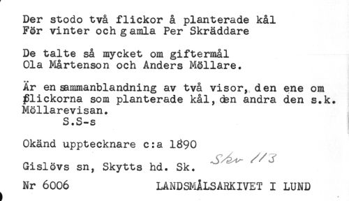 //// Der stodo två flickor å planterade kål //// För vinter och gamla Per Skräddare //// De talte så mycket om giftermål //// Ola Mårtenson och Anders Möllare. //// Är en sammanblandning av två visor, den ene om //// flickorna som planterade kål, den andra den s.k. //// Möllarevisan. //// S.S-s //// . //// * //// Okänd upptecknare c:a 1^90 //// Gislövs sn, Skytts hd. Sk. //// Nr 6006 LANDSMÅLSARKIVET I LUND ////