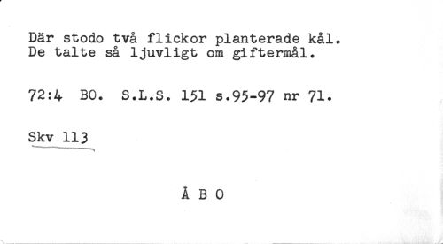 //// Där stodo två flickor planterade kål. //// De talte så ljuvligt om giftermål. //// 72:4 BO. S.L.S. 151 s.95-97 nr 71* //// Skv 113 //// "t ////