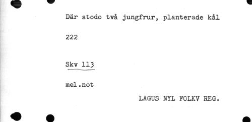 //// - //// Där stodo två jungfrur, planterade kål //// - //// 222 //// Skv 113 //// mel. not //// LAGUS NYL FOLKV REG. ////