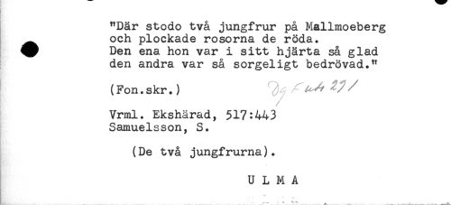 //// j "Där stodo två jungfrur på Mallmoeberg //// I och plockade rosorna de röda. //// I ^ Den ena hon var i sitt hjärta så glad //// den andra var så sorgeligt bedrövad." //// (Fon.skr.) ^ - ^ ^^ //// Vrml. Ekshärad, 517:443 //// Samuelsson, S. //// (De två jungfrurna). //// U L M A ////