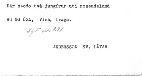 //// Där stodo tva jungfrur uti rosendelund //// Hd Gd 624, Visa, fragm. //// ANDERSSON SV. LÅTAR //// _ ___ ___, ____.____^_____ ////