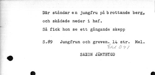 //// Där ståndaren jungfru på brottande berg, //// och skådade neder i haf. //// Så fick hon se ett gångande skepp //// S.39 Jungfrun och greven. 14 str. Mel. //// [ ^ //// /SAXON JÄMTBYGD ////