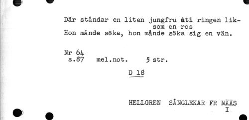 //// ** //// Där ståndar en liten jungfru mti ringen lik- //// som en ros //// Hon månde söka, hon månde söka sig en vän. //// Nr 64 //// s.87 mel.not. 5 str. //// K' //// D 18 //// ! I __ < //// t //// HELLGREN SÅNGLEKAR FR NÄAS ////
