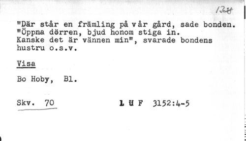 //// "Där står en främling på vår gård, sade bonden. //// "Öppna dörren, bjud honom stiga in. ! //// Kanske det är vännen min", svarade bondens //// hustru o.s.v. //// i //// Visa //// Bo Hoby, Bl. //// Skv. 70 L U F 3152:4-5 //// h ////