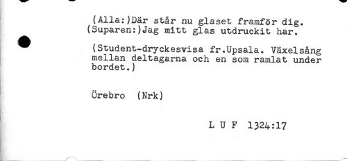//// (Alla:)Där står nu glaset framför dig. //// (Suparen:)Jag mitt glas utdruckit har. //// ^ (Student-dryckesvisa fr.Upsala. Växelsång //// mellan deltagarna och en som ramlat under //// bordet.) //// Örebro (Nrk) //// L U F 1324:17 ////