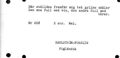 //// Där ställdes framför mig två gyllne skålar //// Den ena full med vin, den andra full med //// tårar. //// Nr 208 2 str. Mel. //// DAHLSTR (M-FORSLIN //// Finländsk //// . '* S ' ' ! ! ////