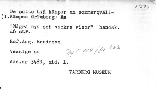 //// / 3 7 //// /De sutto två kämpar en sommarqväll- //// (1.Kämpen Grimborg) Ra //// "Några nya och vackra visor" handsk. //// 46 stf. //// Ref.Aug. Bondeson //// Vessige sn ^ ^^f^/ - ' //// Acc.nr 3439, sid. 1. //// VARBERG MUSEUM ////